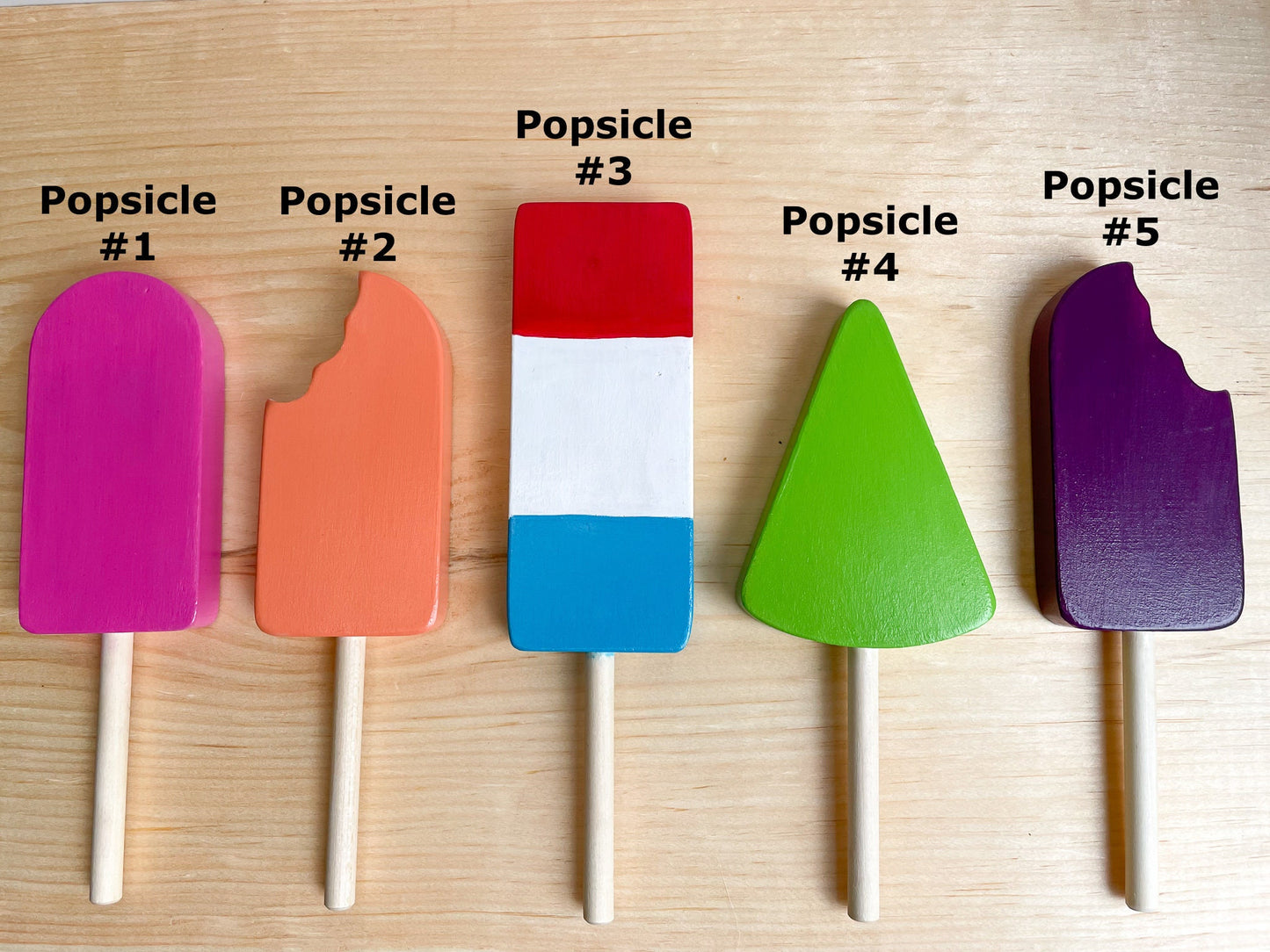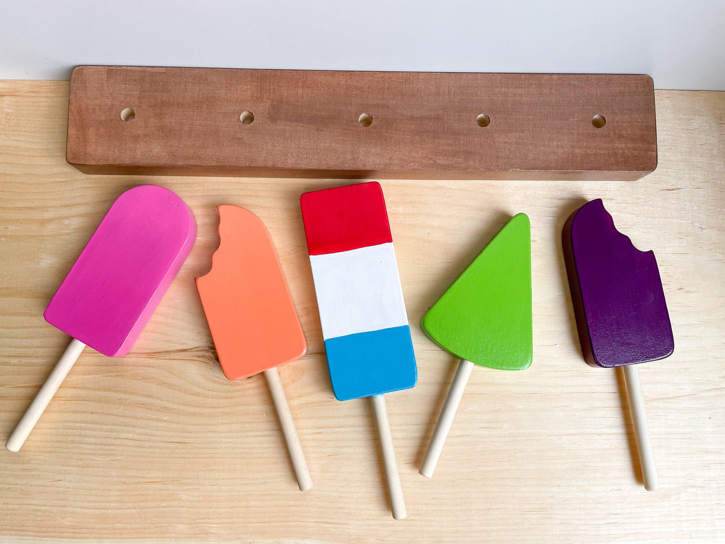 This super sweet popsicle stand is sure to be a hit in your child's outdoor play this summer! It is 100% customizable to include your little one's favourite popsicles. Perfect unique addition to your child's play kitchen that encourages open ended play and fosters imagination. Made from 100% linden wood. Hand painted with non-toxic water-based paint, finished with non-toxic water-based sealant, and topped off with a beeswax finish.