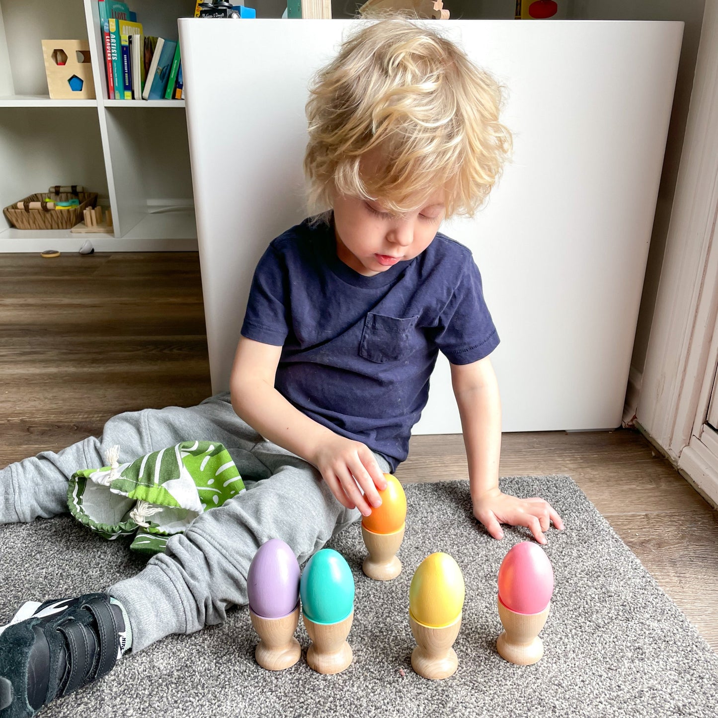 A colourful take on the classic Montessori egg and cup activity! The purpose of the Montessori Egg and Cup is to help babies learn to use both sides of their body together. As simple as this activity seems - babies love it! This set goes one step further and will also teach your little one their first colours. Once they have mastered their colours, you can add it their play kitchen. The perfect activity to grow with them. Great for colour matching + identification! A super fun spring themed activity